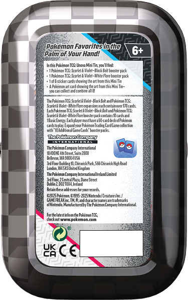 Her får du én stk. Mini Tin fra Scarlet & Violet-serien med det stilfulde Black Bolt & White Flare-design. En kompakt og flot æske fyldt med Pokémon-sjov!